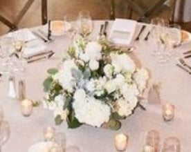 Round table centrepiece with white roses and lissy, blue delphinium and yellow alstro
